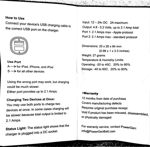 The specs of ‘PowerGen 2.4Amps / 12W Dual USB Car charger Designed for Apple and Android Devices – Black’ are: