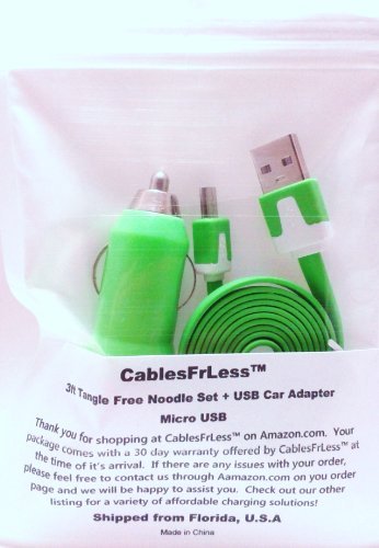 Get CablesFrLess (TM) Green 3ft Tangle Free Flat Noodle Micro USB Charging / Data Sync Cable + USB Car Adapter fits Android Samsung Galaxy S3 Siii S4 S 4 active Galaxy Tab Reverb Note 2 Pantech HTC One LG Optimus Motorola RAZR MAXX HD Kindle at the best price available today.